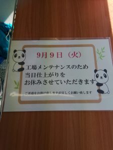 9月9日(火)は工場メンテナンスの為当日仕上がりをお休みさせて頂きます。
