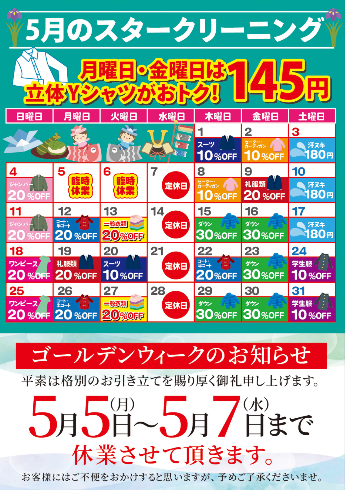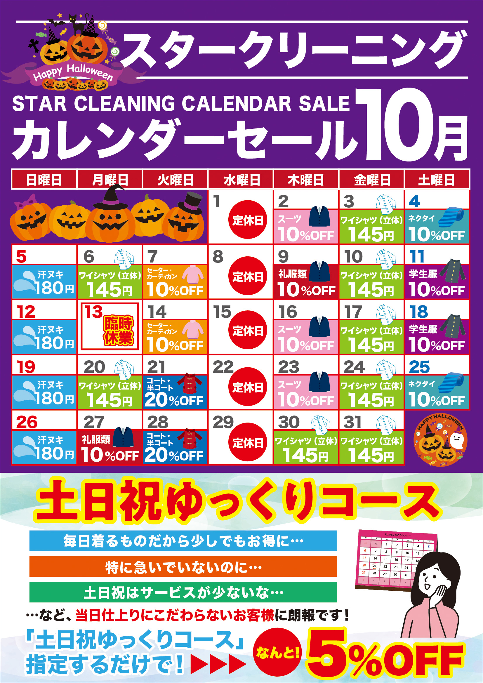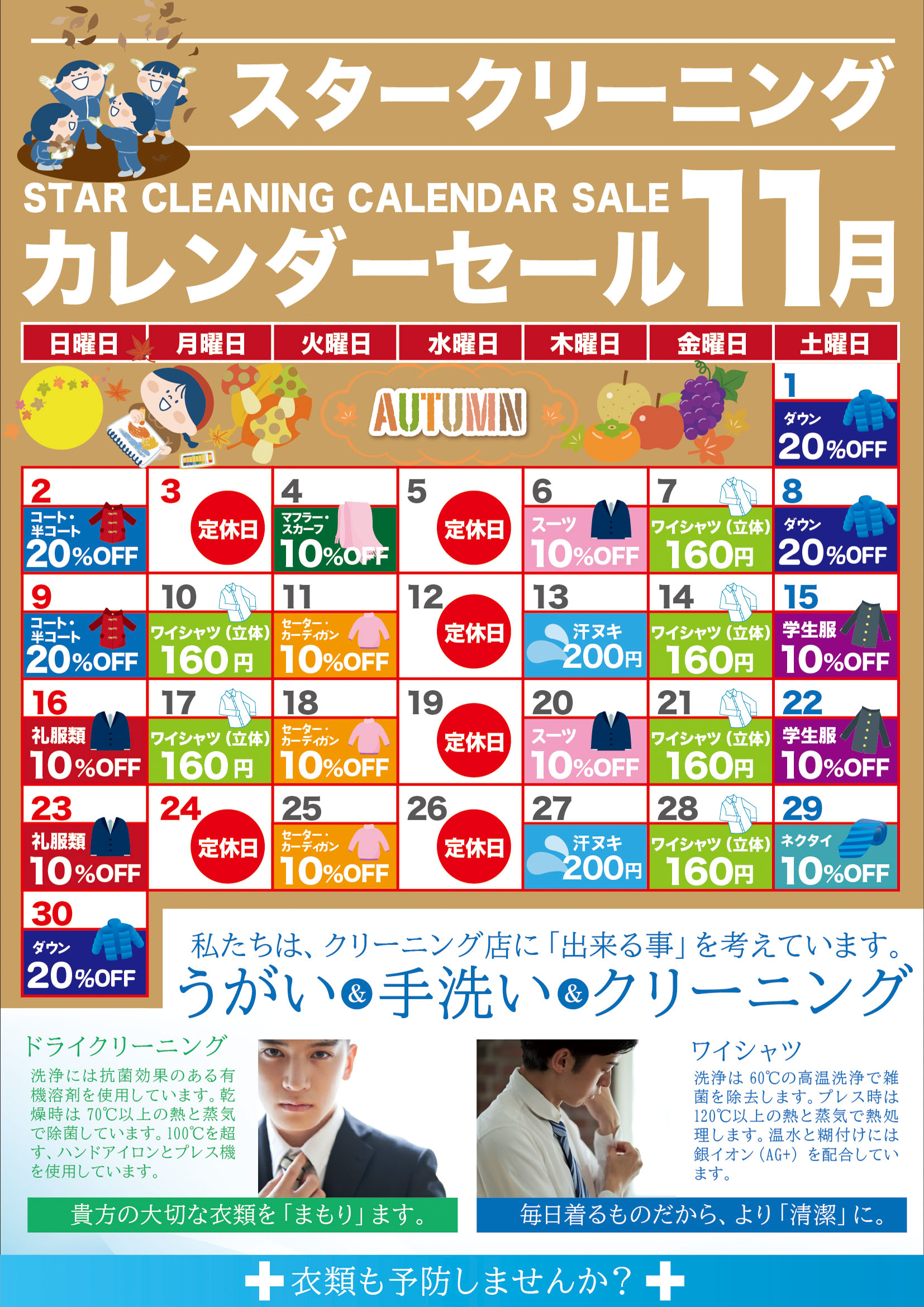 前川店をご利用いただきありがとうございます 10月のカレンダーセールのお知らせです 毎週月曜日と金曜日はYシャツ145円ですが 月末週の27日月曜日は礼服10%OFFとさせていただき 30日木曜日31日金曜日Yシャツ14 [… ...read more